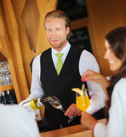 Servicemitarbeiterin trägt ein Tablett mit Wasser und Wein